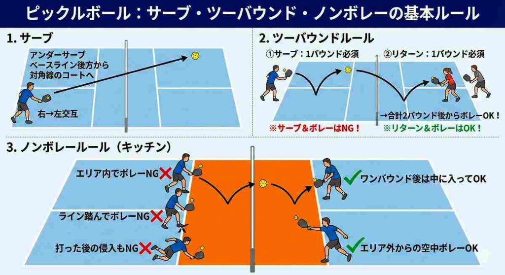 【初心者必見】これだけ覚えればOK!ピックルボールの「サーブ」と「2バウンドルール」